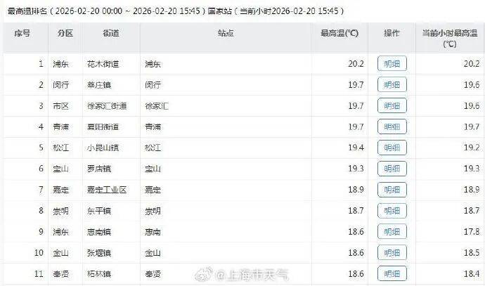 今天的最高气温:浦东20.2℃位列榜首,市区徐家汇和闵行并列第二,都是19.7℃。午后户外是妥妥的春日体感~~