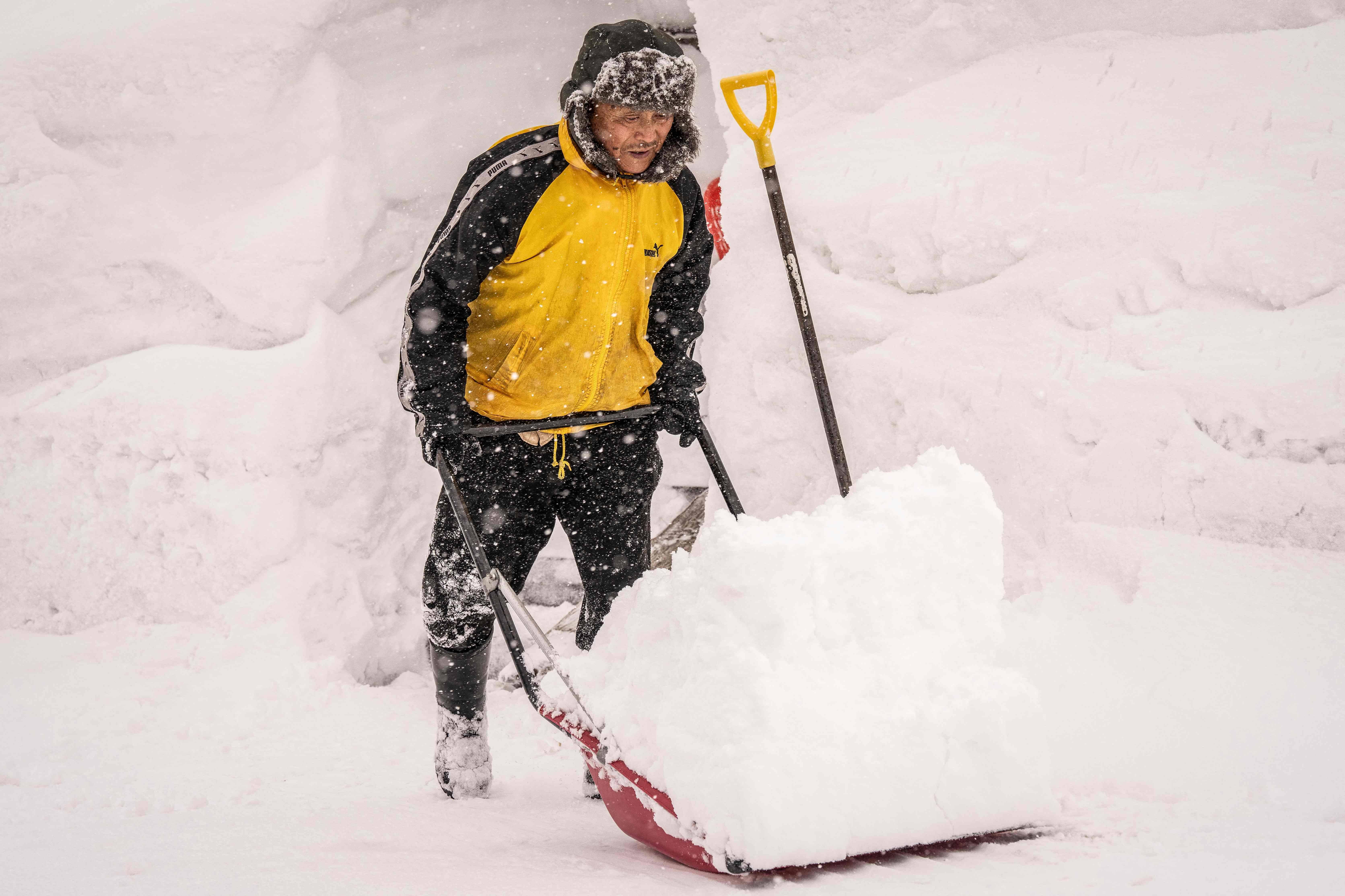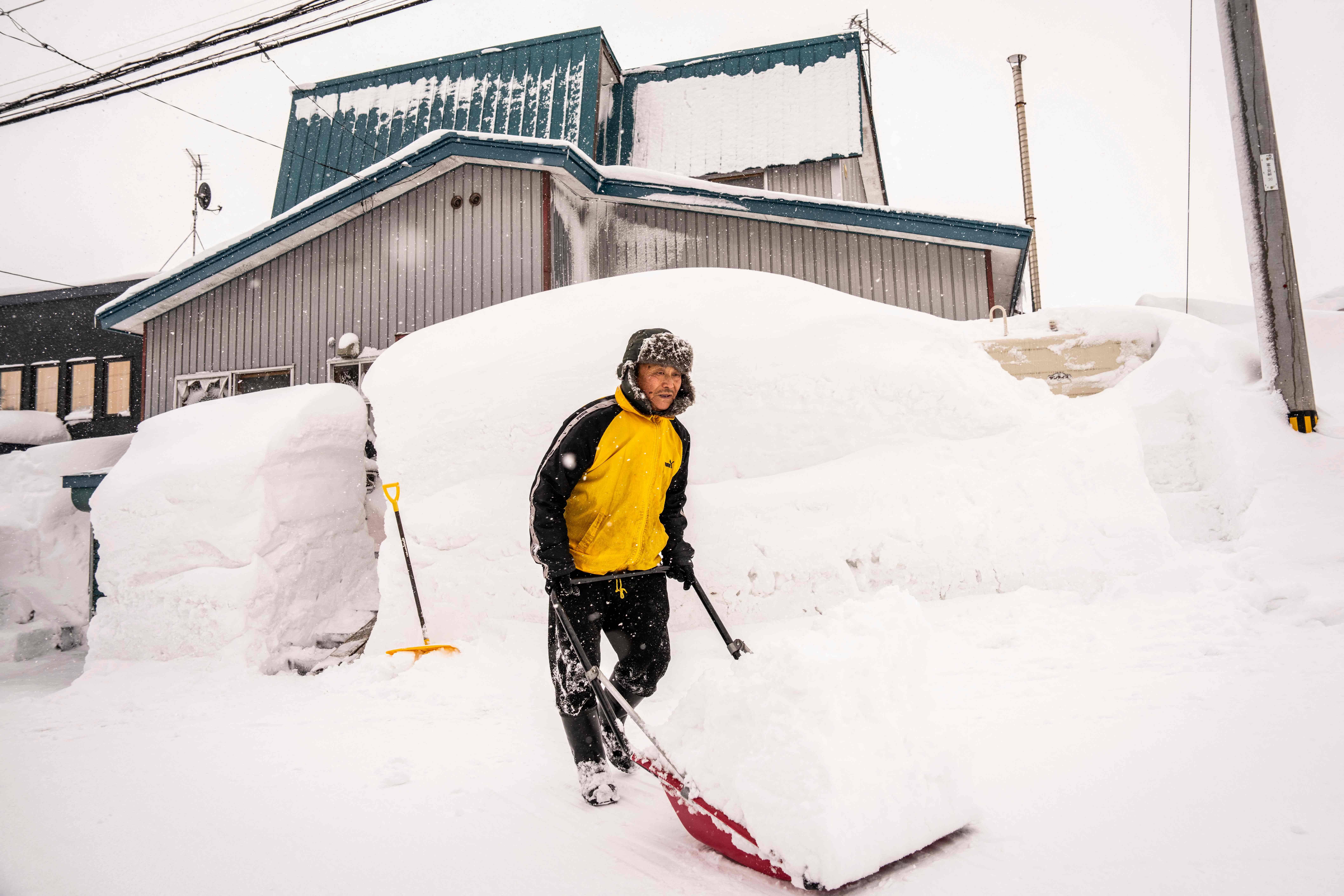 2月19日,在日本北海道仁世户,一名男子在房屋前铲雪。 新华社/法新