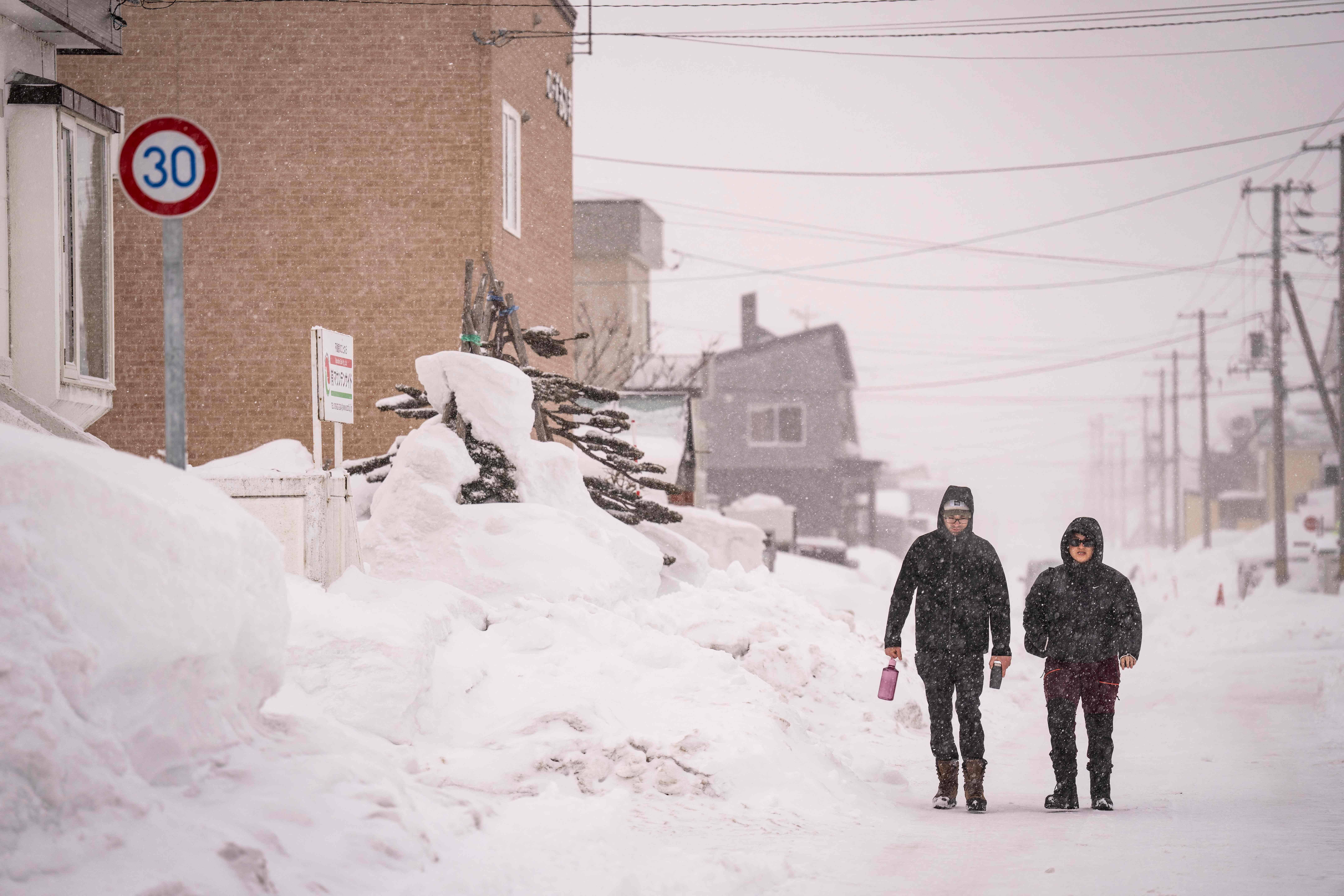 2月19日,在日本北海道俱知安,人们走在被积雪覆盖的街道上。 新华社/法新