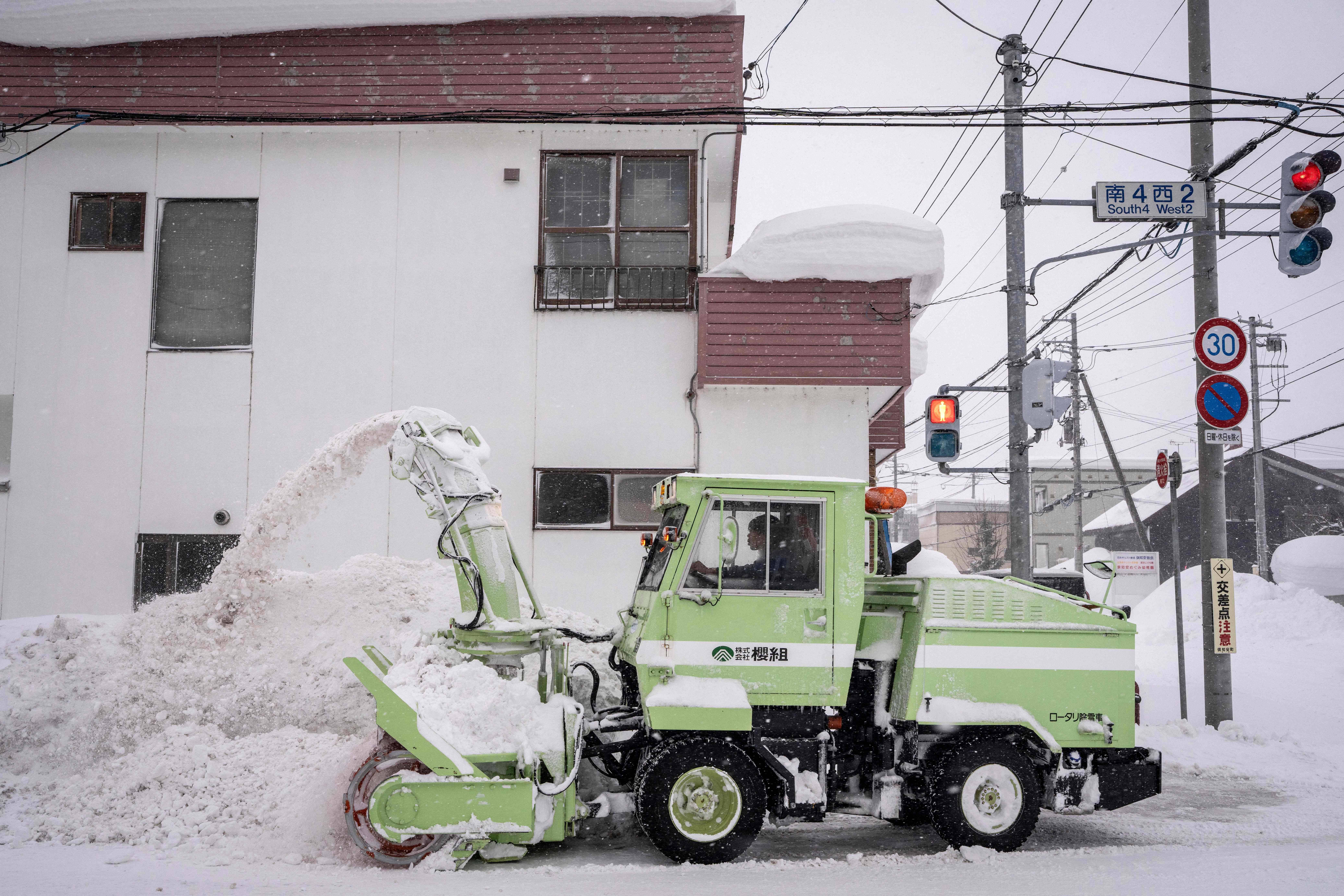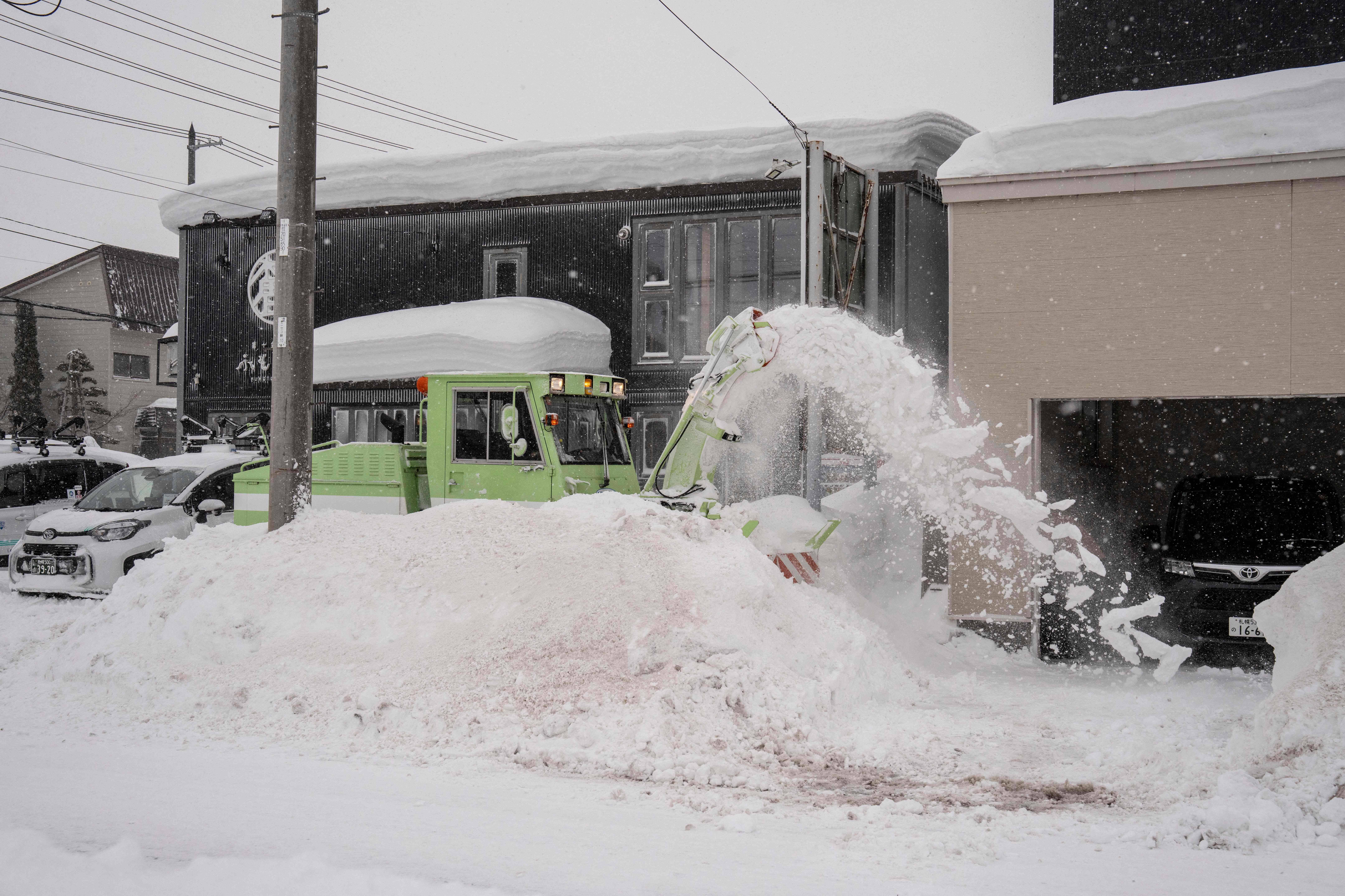 2月19日,在日本北海道俱知安,工作人员驾驶铲雪车铲雪。 新华社/法新