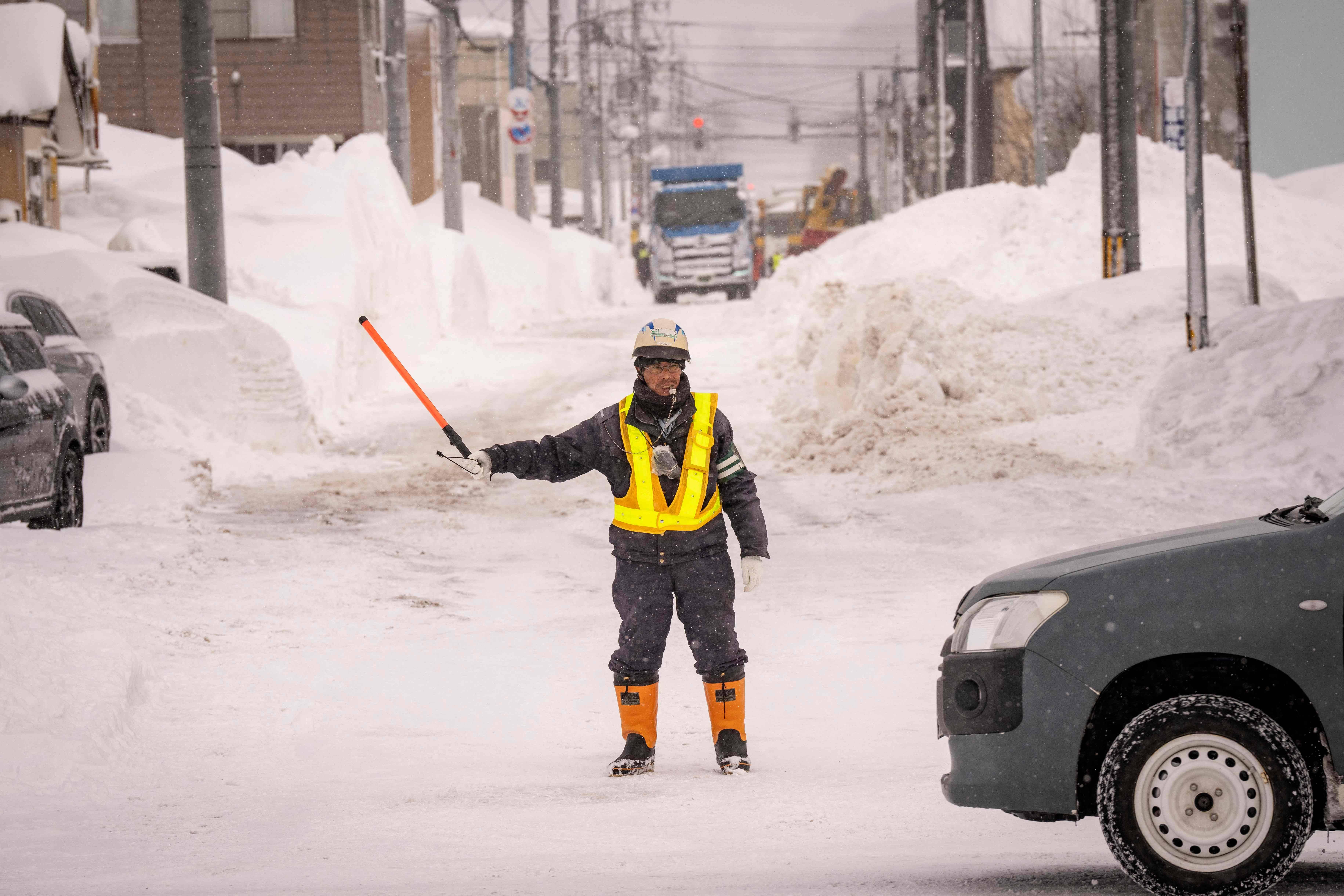 2月19日,在日本北海道俱知安,一名保安在被积雪覆盖的路口指挥交通。 新华社/法新