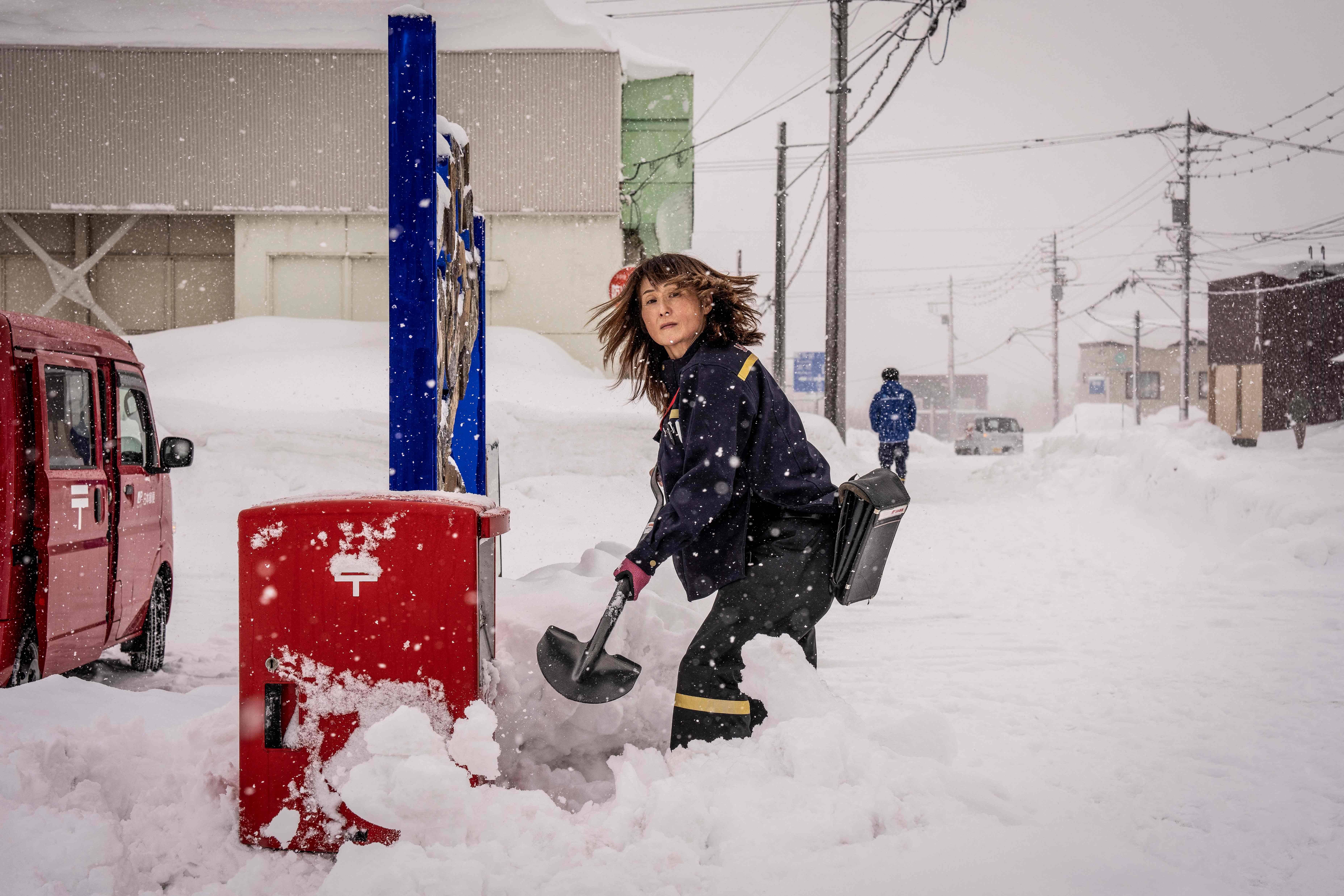 2月19日,在日本北海道仁世户,一名邮政工人在邮箱前铲雪。 新华社/法新