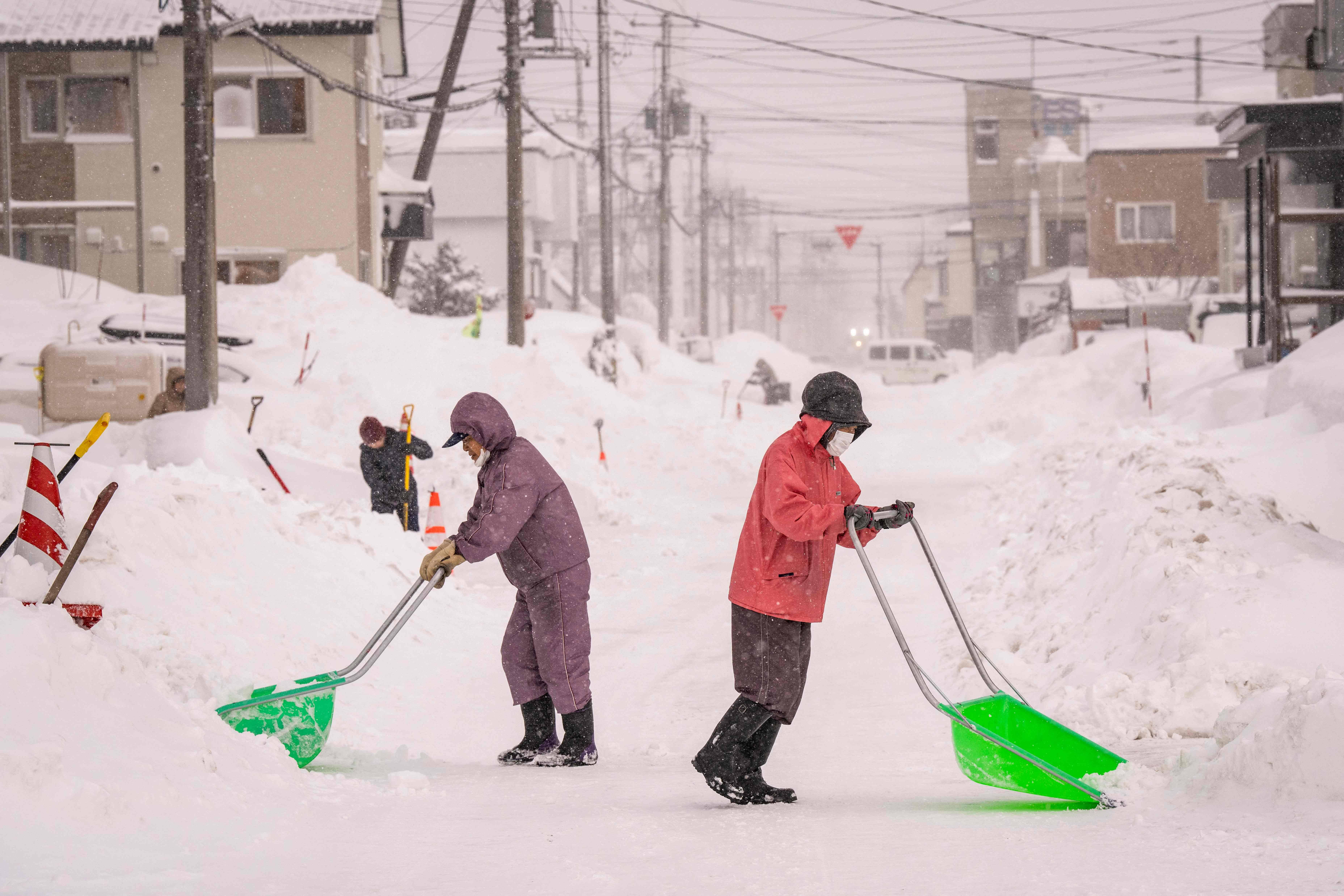 2月19日,在日本北海道俱知安,人们在街道上铲雪。 新华社/法新