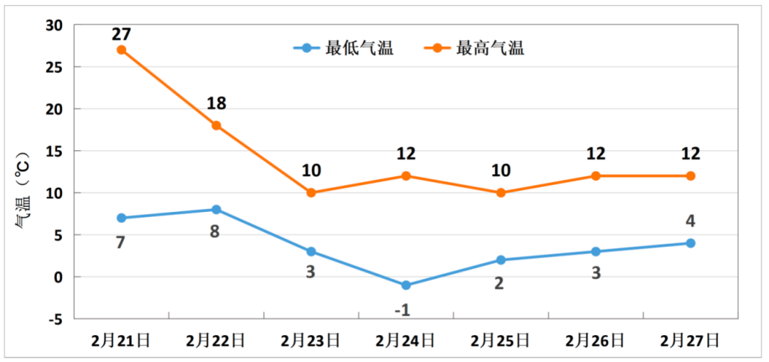 2026年2月21日至27日郑州气温趋势图(单位:℃)
