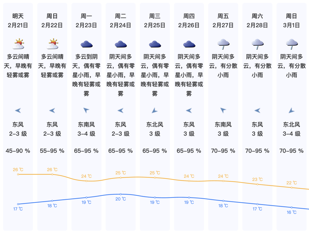 21日(初五),韶关、清远、肇庆、云浮和粤西市县多云到阴天,局部有零星小雨,其余市县多云间阴天,大部市县早晚有(轻)雾。早晨最低气温:粤北偏北市县9-12℃,粤西和珠江三角洲南部市县17-19℃,其余市县13-16℃。