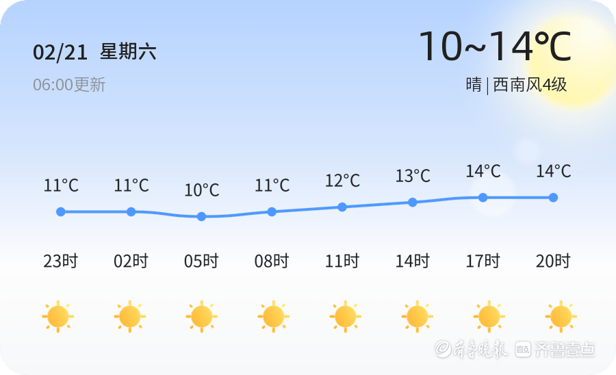 今天是2月21日,正月初五,青岛市迎来晴朗天气。气温方面,今天白天最高气温14℃,最低气温10℃,目前温度为9.2℃。风向为西南风4级,空气湿度为73%,PM2.5浓度为65,空气质量为良好。市民朋友们可以放心外出,但建议随身携带外套,以应对早晚温差。由于风力较大,外出时请注意远离广告牌和大树,确保安全。