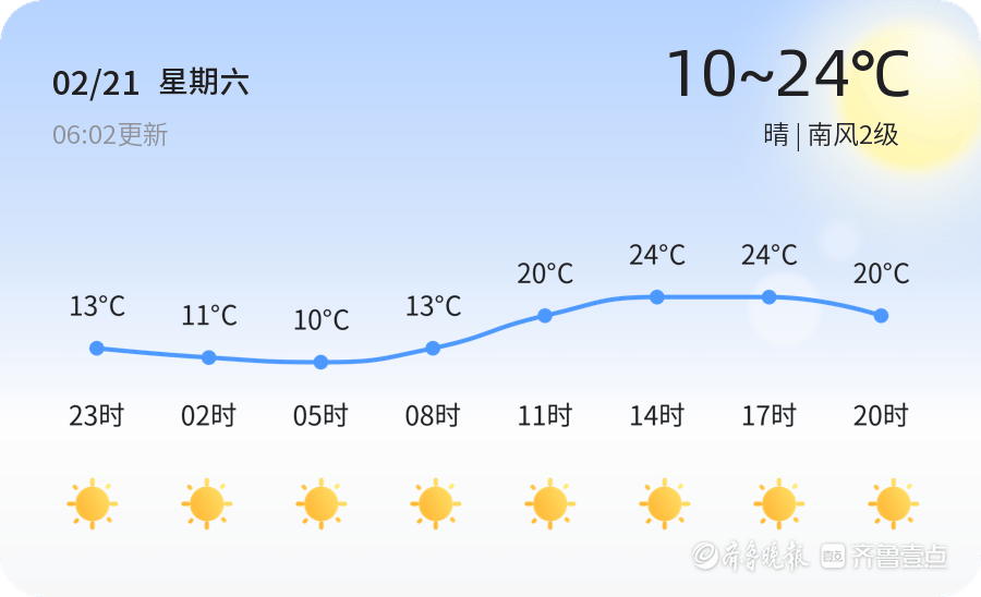 今天是2月21日,星期六,农历正月初五。东营市今日天气晴朗,气温适中,全市各区均以晴天为主,白天气温最高可达24℃,最低气温为10℃。当前温度为9.6℃,南风2级,空气湿度为63%,PM2.5指数为74,空气质量良好。市民朋友们可以放心进行户外活动,享受这美好的冬日阳光。