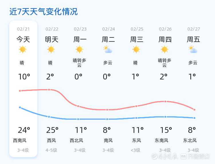 未来三天,东营市天气以晴转多云为主,气温波动较大。2月23日,天气晴转多云,最低气温为0℃,最高气温为11℃,风力为西北风3-4级。2月24日,天气多云,气温维持在0℃至8℃之间。2月25日,天气晴朗,气温略有回升,最低气温为1℃,最高气温为11℃。由于气温变化较大,市民朋友们需根据天气变化及时调整衣物,避免着凉。