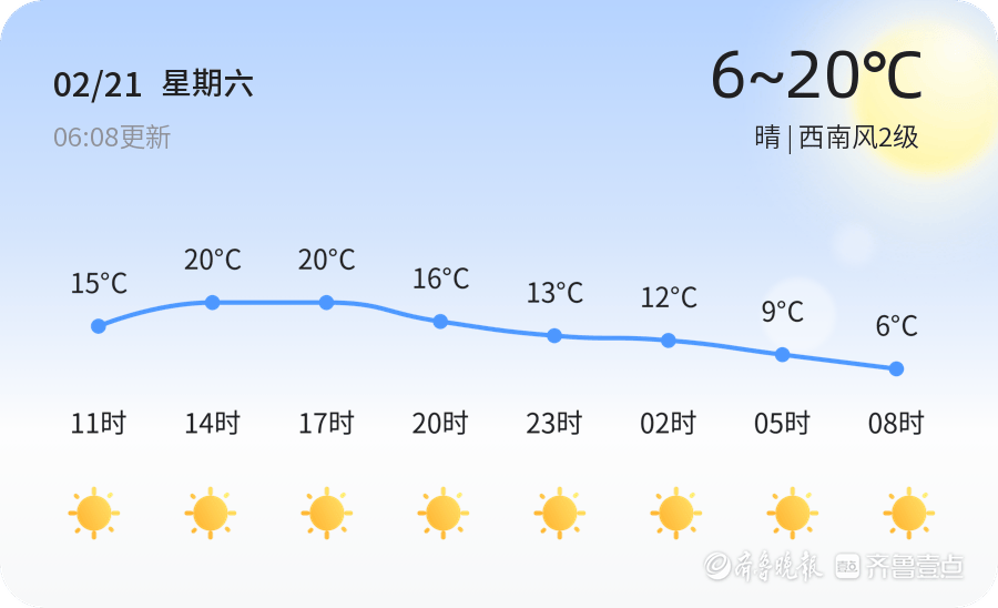 今天是2026年2月21日,农历正月初五,周六。临沂市今日天气晴朗,气温介于6℃至20℃之间,西南风2级,空气湿度为84%。PM2.5浓度为60,空气质量为良。市民外出时可以享受良好的空气环境,但需注意大风天气可能带来的影响。由于今日风力较大,建议市民外出时注意防风,尤其是老年人和儿童,避免在风口长时间停留。