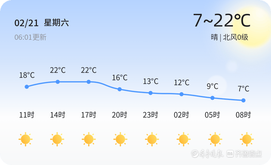 今天是2月21日,星期六,农历正月初五。枣庄市今天天气晴朗,北风0级,气温介于7℃至22℃之间。目前实时气温为4.3℃,空气湿度为89%,PM2.5指数为62,空气质量良好。各区天气情况基本一致,均为晴朗天气,适合户外活动。