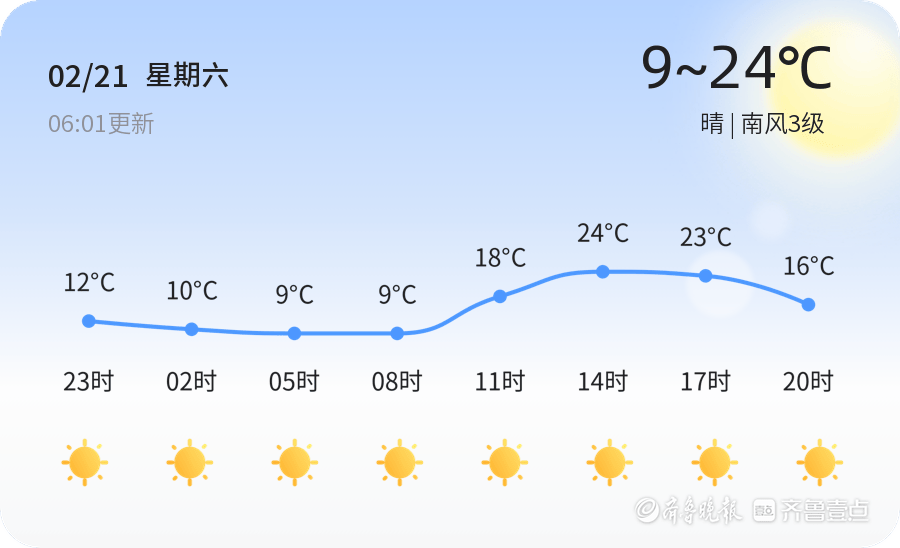 今天是2026年2月21日,农历正月初五,星期六。淄博市今天天气晴朗,温度适宜,白天气温最高可达24℃,最低气温为9℃,风力为南风3级,空气湿度56%,PM2.5指数为62,空气质量良好。各区县天气情况一致,均为晴朗天气,适宜市民户外活动。