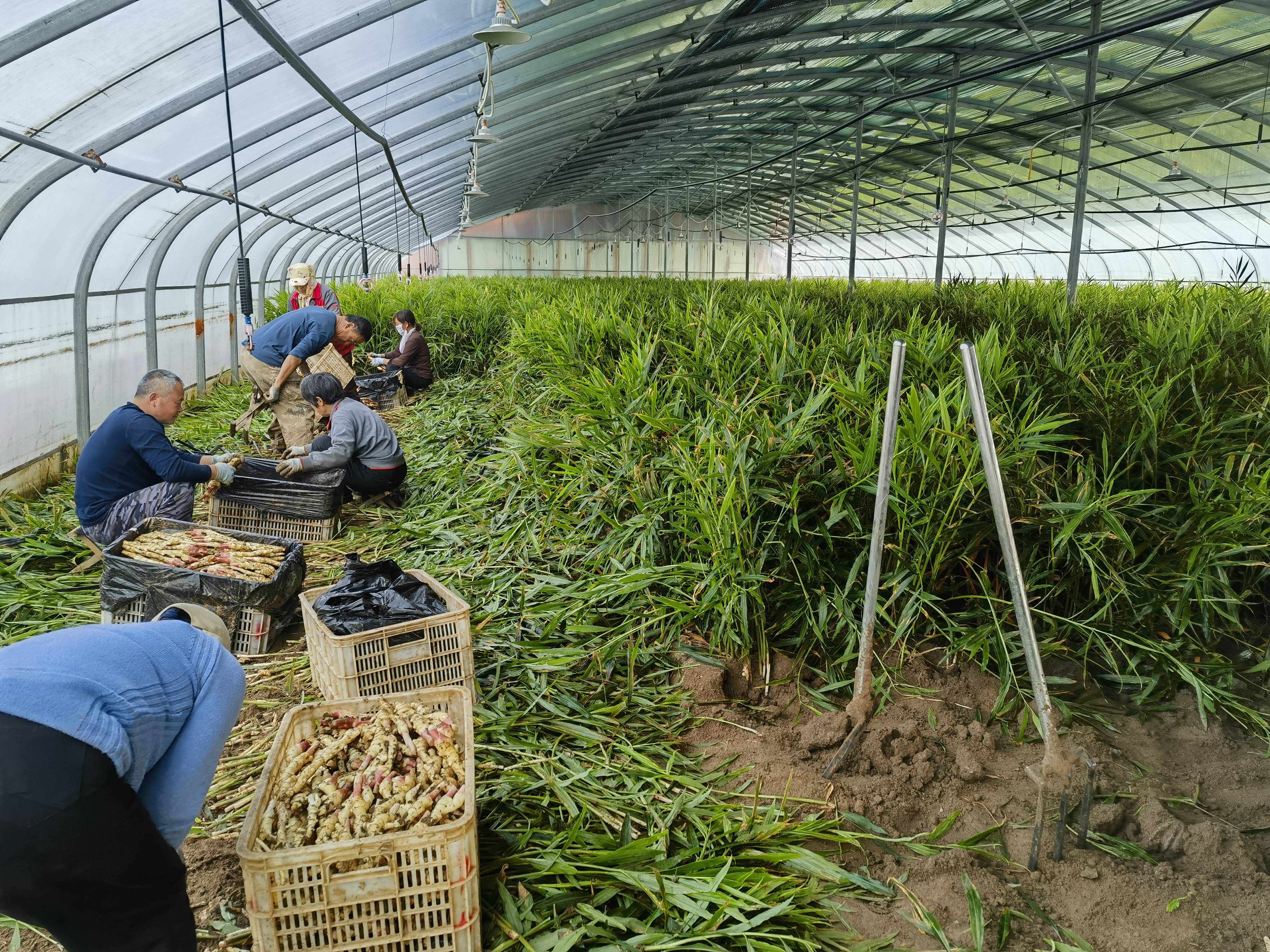 姜农们在安丘市凌河街道石家庄村的高效农业种植示范园里收获红芽姜。新华社记者王志 摄