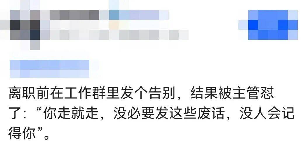 一个哥们离职,在工作群里发了段告别。主管当场怼回来:"你走就走,没必要发这些废话,没人会记得你。"