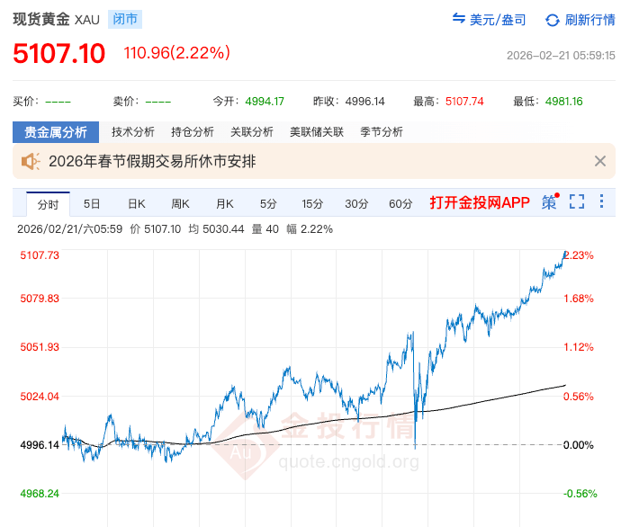 从北京时间2月21日凌晨开始,伦敦金属交易所现货黄金价格持续走高,在闭市前重回5100美元/盎司,最终闭市价格为5107.1美元/盎司。这是1月30日金价大跌以来首次重回5100美元/盎司。