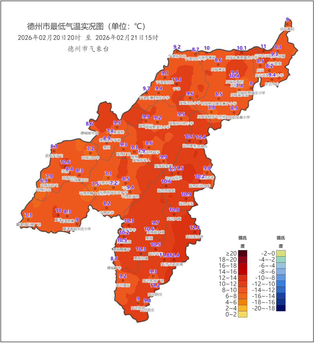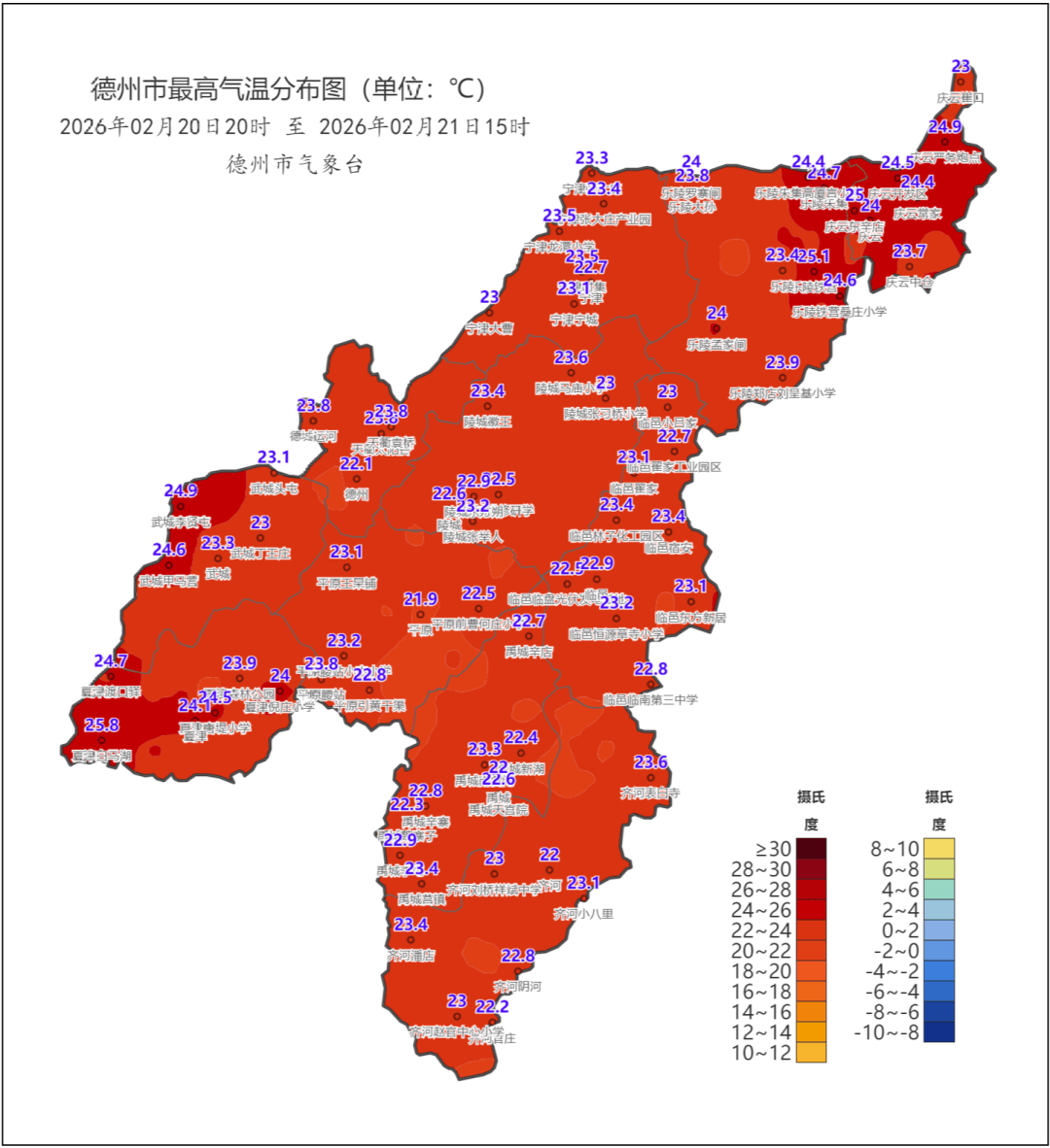 德州市气象台2026年02月21日08时51分发布寒潮蓝色预警:受强冷空气影响,预计21日傍晚到23日我市将出现寒潮天气,气温明显下降。最低气温降幅8~10℃,23日早晨最低气温-1℃左右,最高气温降幅13~15℃,22日、23日白天最高气温10~12℃,请注意防范。