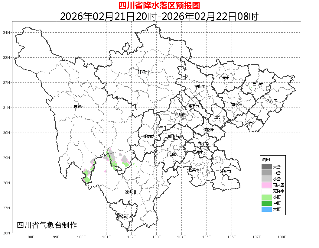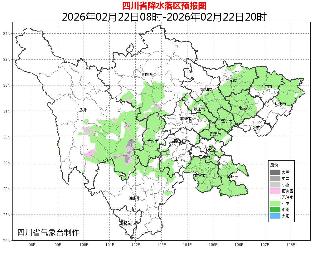 未来三天:盆地大部有阵雨或雷雨,东北部有中雨,个别大雨,23日白天大部有4~6级偏北风,局地可达7级或以上,日平均气温下降2~4℃,日最高气温下降6~8℃;22日阿坝州南部、甘孜州中东部和凉山州北部,23-24日阿坝州大部、甘孜州北部东部和凉山州东北部有阵雪(雨),局地中雪,需防范雨雪天气和道路结冰带来的不利影响,川西高原和攀西地区其余地方午后到傍晚风力较大,森林草原火险气象等级较高,需加强火源管理和森林防火工作。