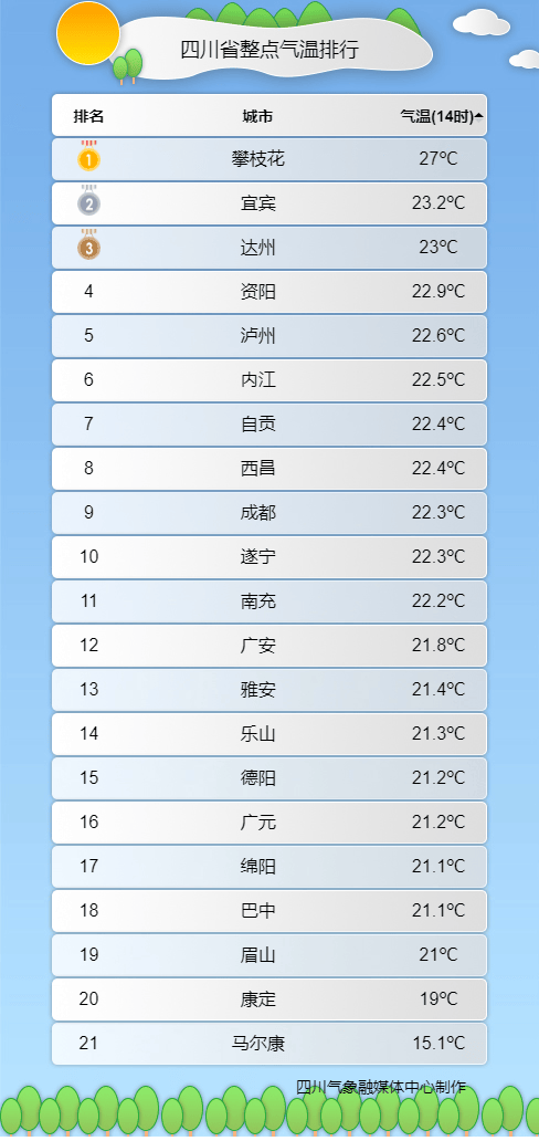 24小时内,盆地最低气温:北部7~10℃,其余地方11~14℃;最高气温:22~25℃。