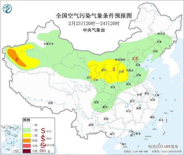 受冷空气大风影响,预计2月21日20时至22日20时,新疆东部和南部、内蒙古中西部、青海东北部、甘肃中部、宁夏、陕西大部、山西、辽宁大部、北京、天津、河北、河南、山东、安徽、江苏、上海、湖北、湖南北部、浙江北部等地有扬沙或浮尘天气,其中内蒙古西部等地的部分地区有沙尘暴,局地有强沙尘暴。中央气象台于2月21日18时继续发布沙尘暴黄色预警。