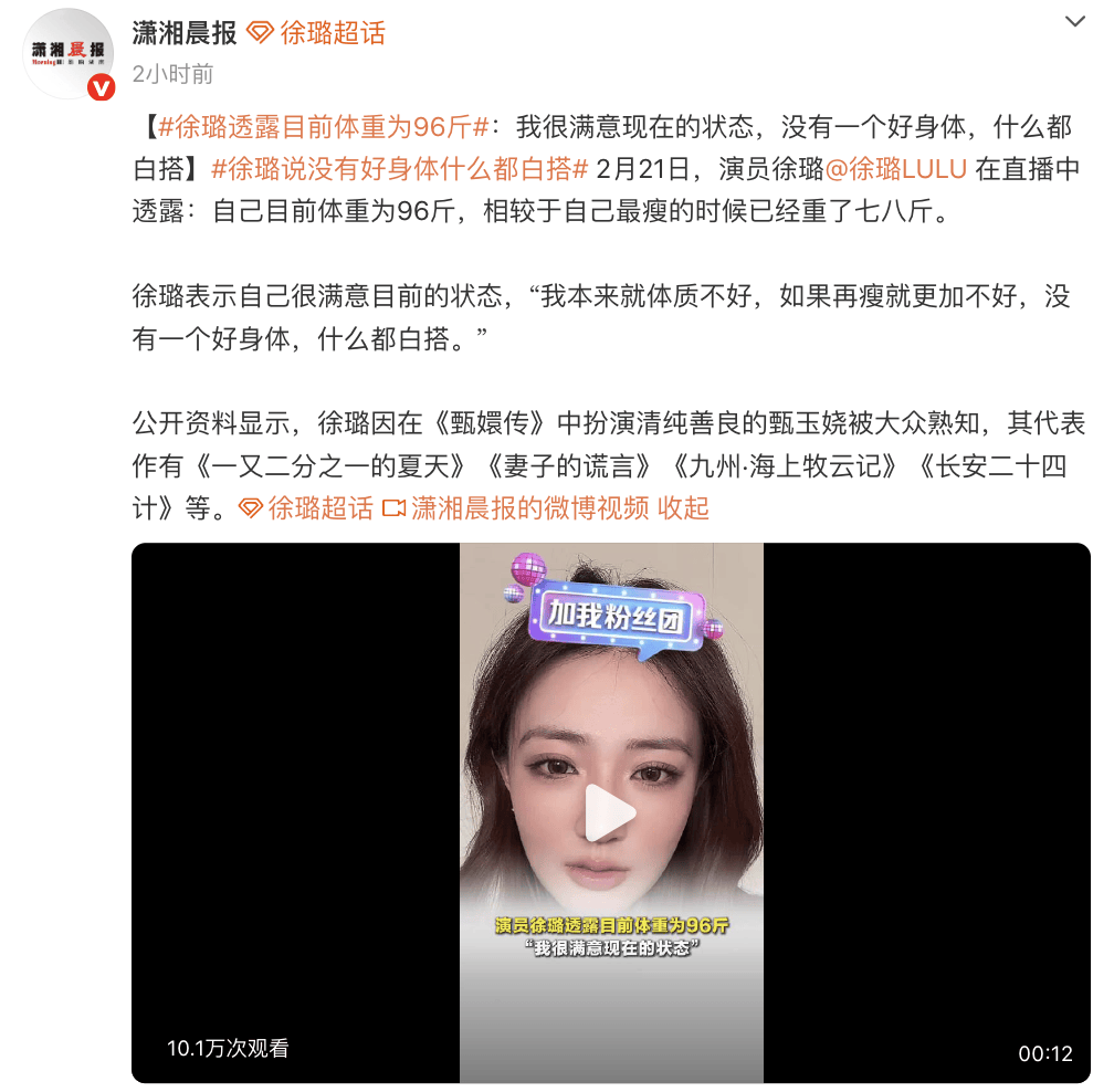 2月21日,演员徐璐在直播中透露:自己目前体重为96斤,相较于自己最瘦的时候已经重了七八斤。