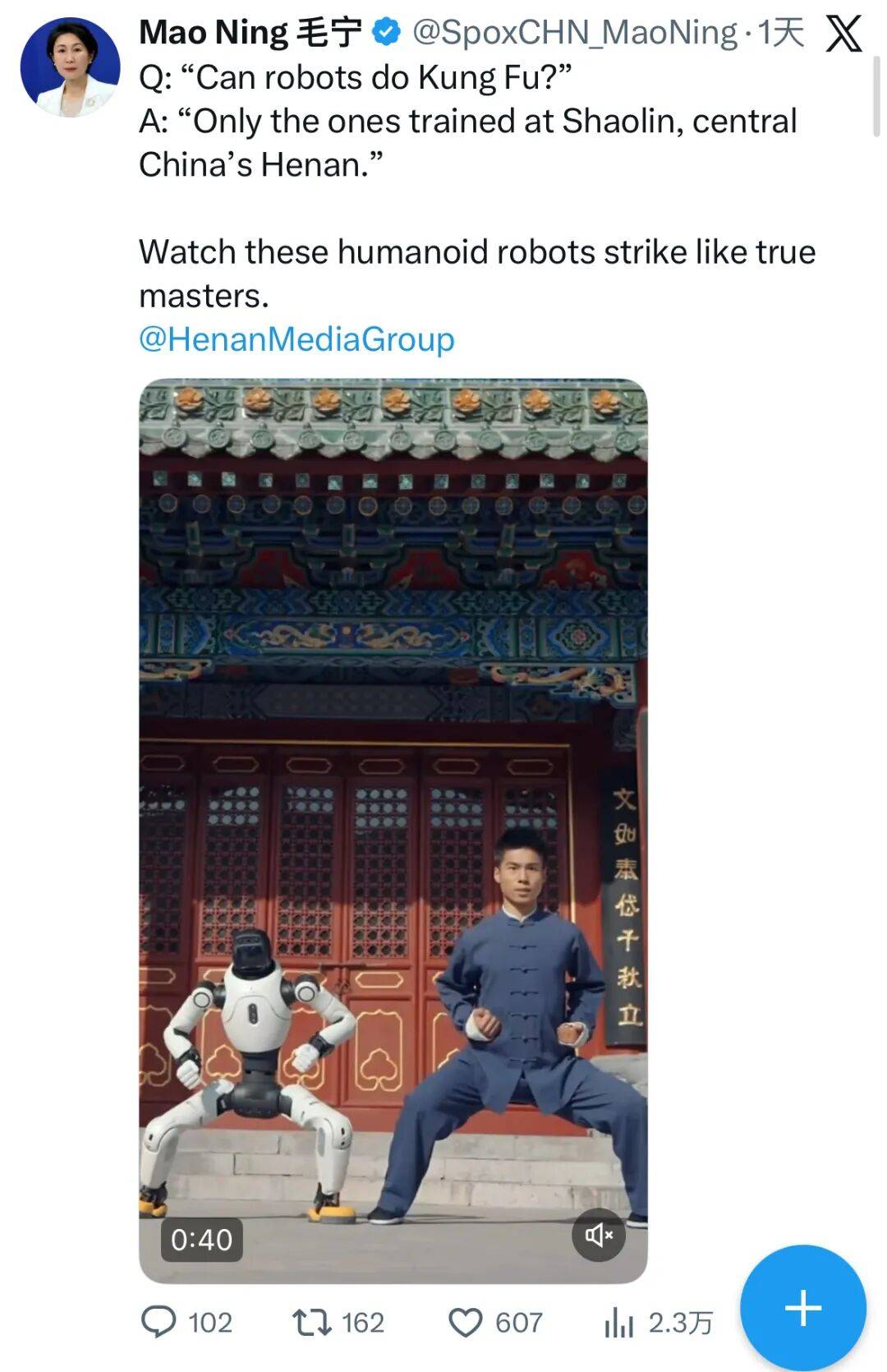 近日,外交部发言人毛宁在metaPage等海外社交平台的个人账号发布2026河南春晚《功夫机缘》,并配文:“机器人也会功夫吗?只有在中国中部河南练就一身本领的机器人才行。”随后,外交部发言人办公室转发相关内容,向全世界推介。