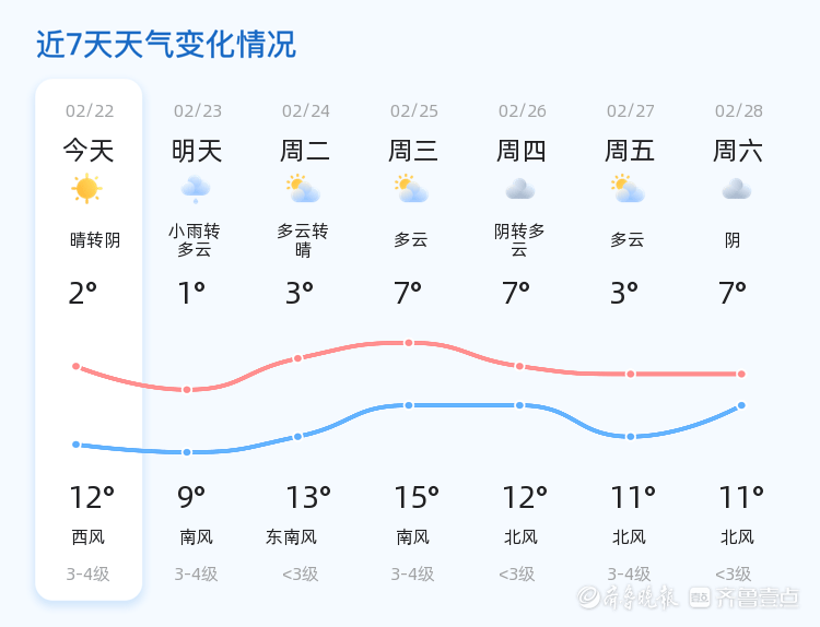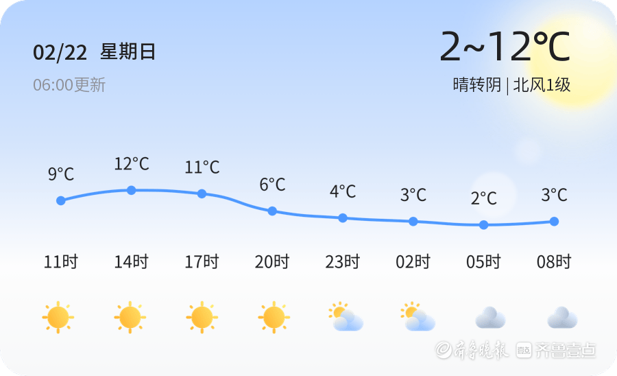 今天是2月22日,农历正月初六,济南迎来晴转阴的天气。今天济南市各区的天气情况总体平稳,白天气温在2℃到12℃之间,夜间气温较低,最低气温为2℃。目前济南市的温度为7.9℃,天气状况为晴转阴,北风1级,空气湿度为22%,PM2.5指数为232。市民出行时请注意天气变化,适时增减衣物。