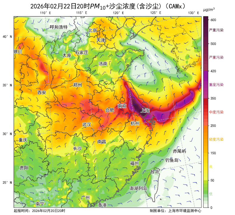 2月21日,我国西北地区出现大范围沙尘天气,多地出现重度至严重污染水平。根据预测,22日凌晨起,沙尘气团开始影响长三角地区,预计中午前后影响上海,出现短时中度及以上污染过程;23日凌晨,上海主导风向转为东北风,沙尘气团逐渐过境,中午前后沙尘影响基本结束,空气质量好转为优良。