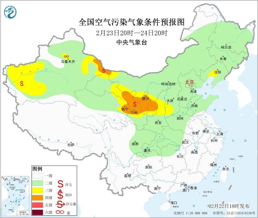 受冷空气大风影响,预计2月22日20时至23日20时,新疆南疆盆地、甘肃中东部、宁夏、陕西中北部、山西南部、河北南部、山东南部、河南、湖北中北部、江西北部、安徽、江苏、上海、浙江中北部、吉林南部、辽宁北部等地的部分地区有扬沙或浮尘天气。中央气象台于2月22日18时继续发布沙尘暴蓝色预警。