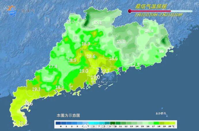 23日(初七),肇庆北部、粤北偏北和粤东沿海市县多云到阴天,有分散小雨,其余市县多云间阴天,局部有零星小雨,大部市县早晚有(轻)雾。早晨最低气温:粤西沿海和珠江三角洲中南部市县17~20℃,其余大部市县14~16℃。