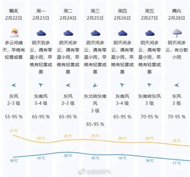 但从明天(2月23日)开始,深圳天气将逐渐转阴,气温略降至19℃。