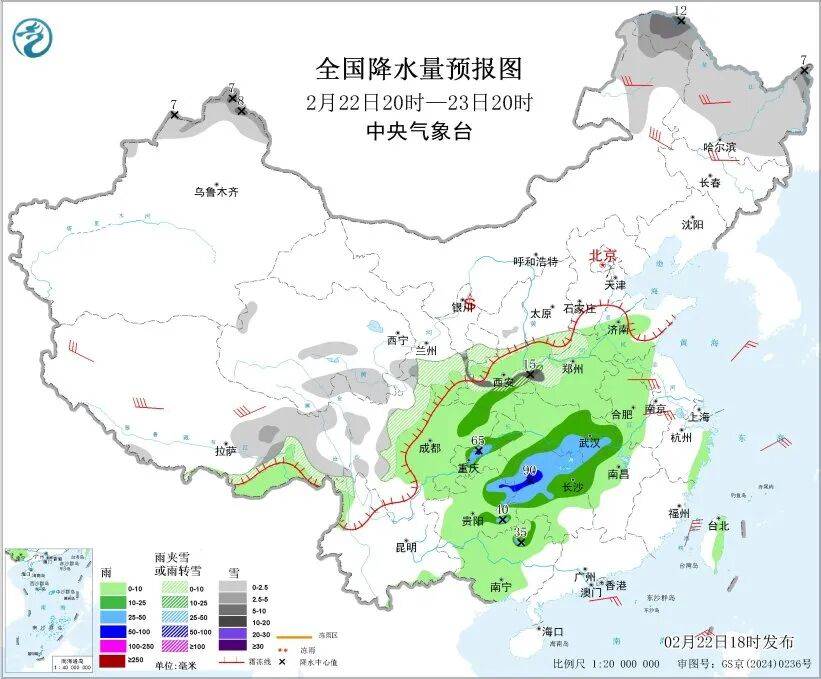 图3 全国降水量预报图(2月22日20时-23日20时)