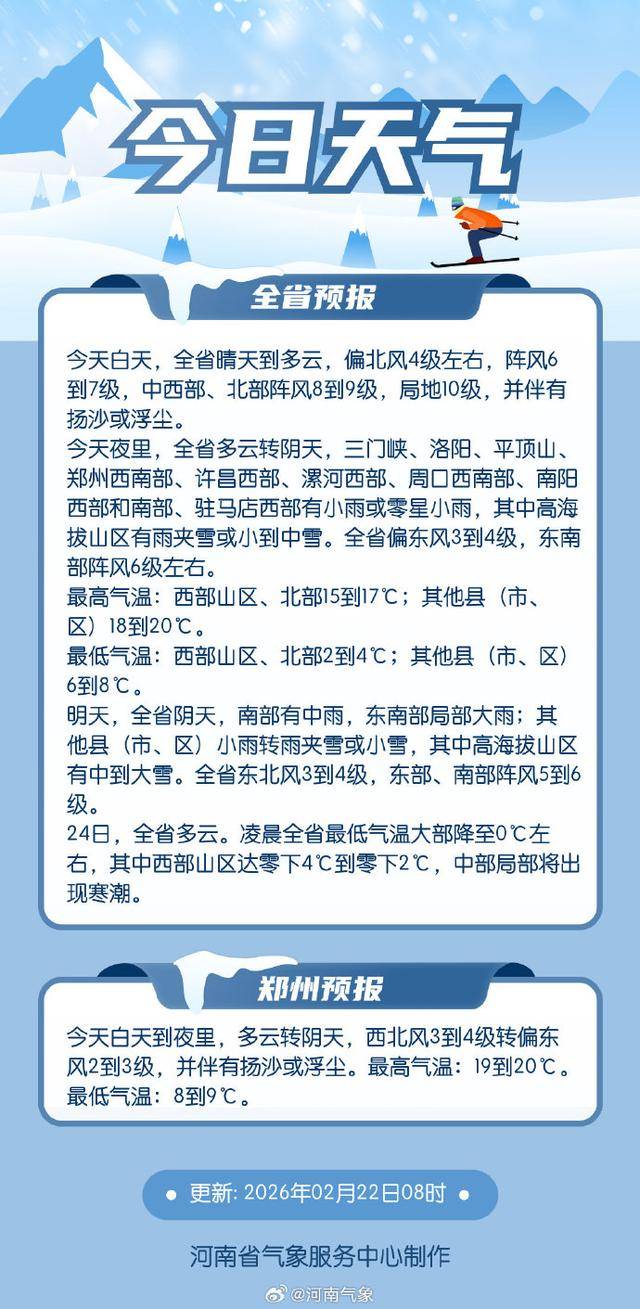 记者从河南省气象局了解到,受冷空气和暖湿气流共同影响,省气象台预计2月22日(初六)夜里至23日(初七)我省有一次雨雪大风降温天气过程。22日(初六)夜里,中西部、西南部有小雨或零星小雨,高海拔山区有雨夹雪或小到中雪。23日(初七),南部有中雨,东南部局部大雨;其他县(市、区)小雨转雨夹雪或小雪,其中高海拔山区有中到大雪。25日至26日,我省还有一次小雨天气过程,南部局部有中雨,西部山区有雨夹雪。
