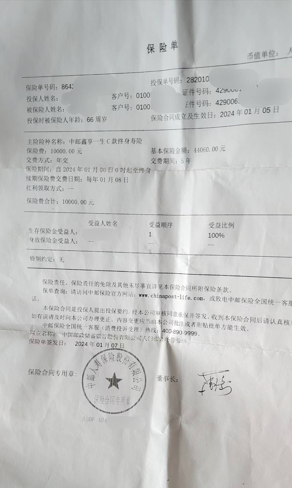 据陈先生提供的保单照片显示,其母亲所购买的是中邮人寿保险股份有限公司的“中邮鑫享一生C款终身寿险”,缴费期为五年,年缴保费1万元。