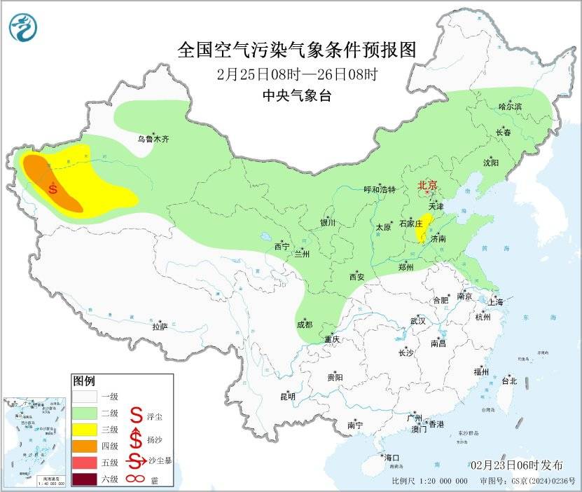由于沙尘天气范围缩小、强度减弱,因此解除沙尘暴蓝色预警。但2月23日08时至24日08时,青海东北部、宁夏中北部、陕西中北部、河南、湖北北部、浙江中部等地的部分地区仍有扬沙或浮尘天气。