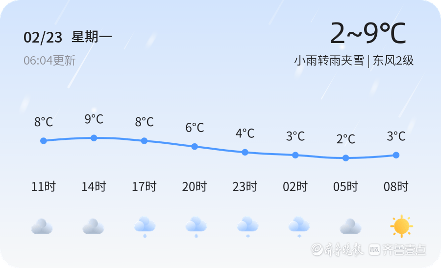 今天是2月23日,星期一,农历正月初七。济宁市迎来小雨转雨夹雪天气,气温在2℃至9℃之间,东风2级,空气湿度40%,PM2.5指数88。全市各区普遍出现雨雪天气,市民出行需注意防滑保暖。