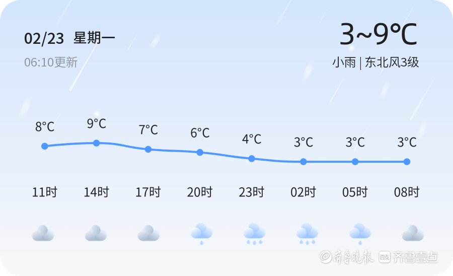 2月23日,星期一,农历正月初七,临沂迎来小雨天气,气温在3℃到9℃之间。今天早晨6时,临沂的气温为1.5℃,伴有小雨,风向东北风3级,空气湿度为46%,PM2.5指数为25,空气质量良好。各区的天气情况基本一致,均为小雨,气温在3℃到9℃之间波动。