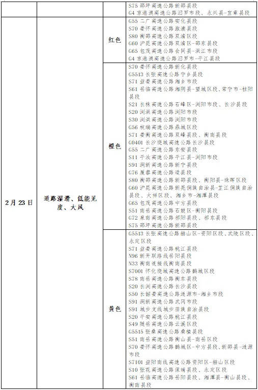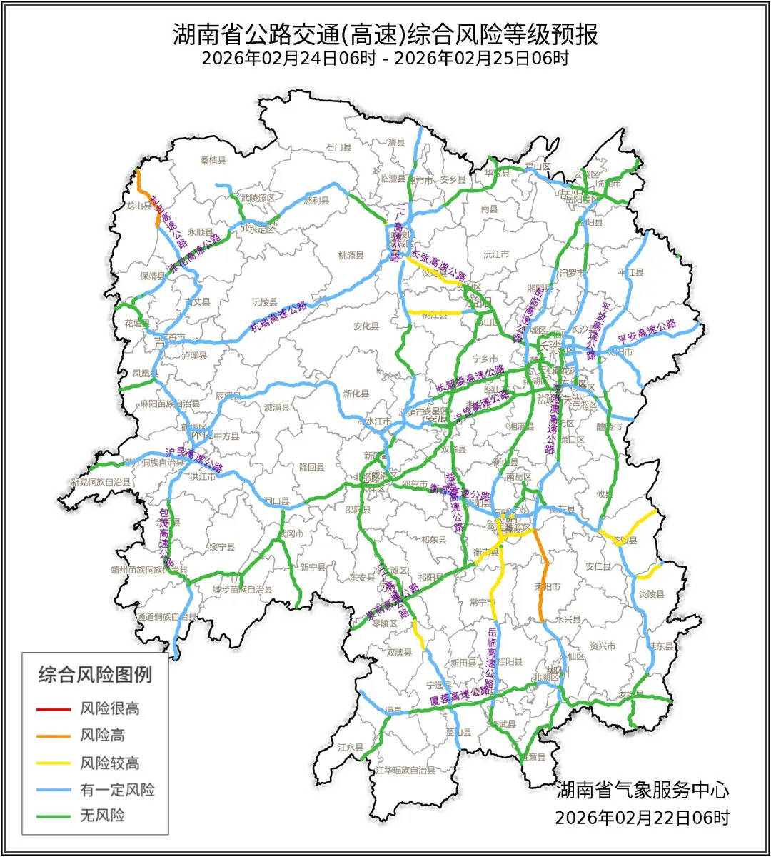 2月23至2月24日湖南省高速公路综合风险等级图