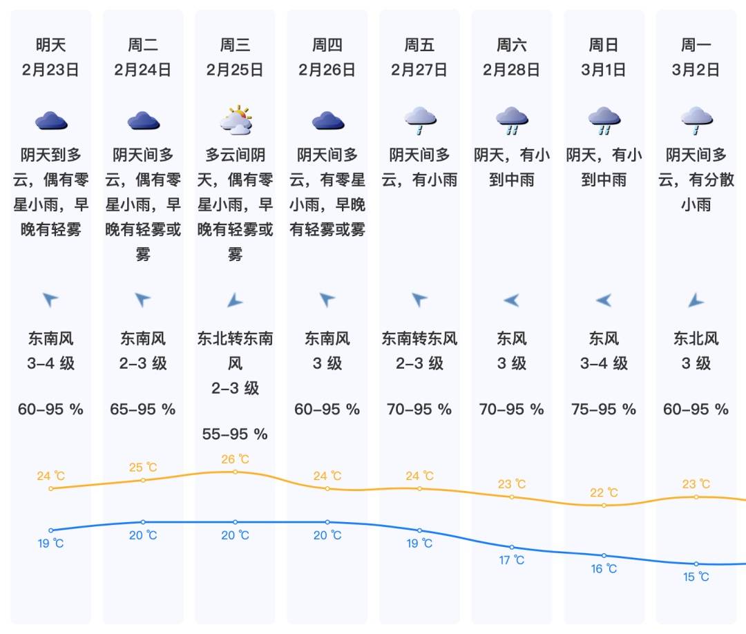 23日(初七)阴天间多云,偶有零星小雨,早晚有轻雾或雾,偏东风3-4级,气温略降;