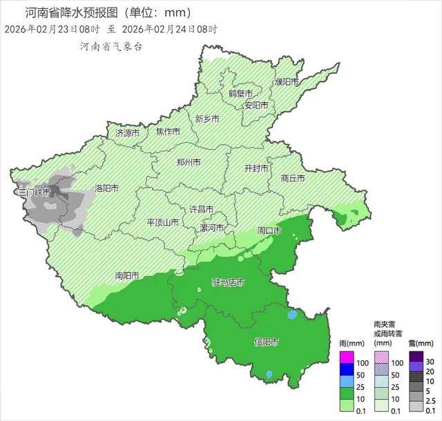 2月23日,记者从河南气象获悉,今天白天到夜里,全省阴天,黄河以北和三门峡、洛阳、郑州、平顶山北部、许昌北部小雨转雨夹雪或小雪,其中高海拔山区有中到大雪。其他县(市、区)有小雨,其中周口南部、南阳东部、驻马店、信阳部分县(市、区)有中雨。 全省东北风3到4级,阵风6级左右。 最高气温:西部山区、北部6到8℃;东部、西南部12到14℃;其他县(市、区)9到11℃。 最低气温:东部、南部3到5℃;其他县(市、区)0到2℃。