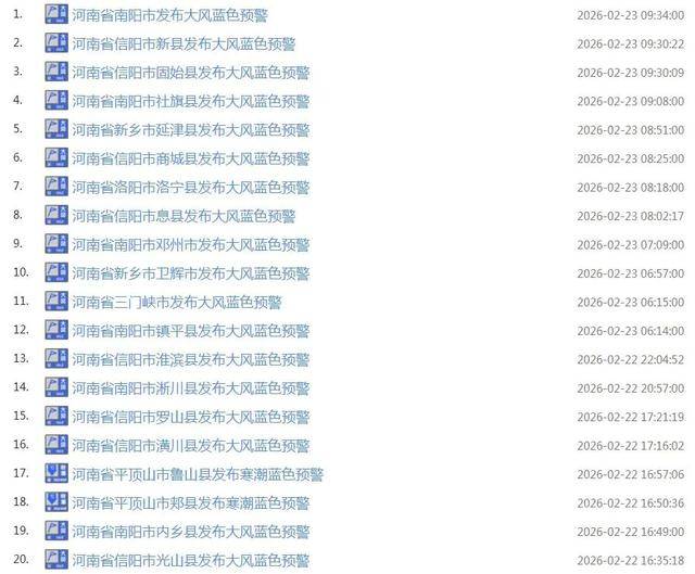 郑州市:今天白天到夜里,阴天转小雨或雨夹雪,偏北风3到4级,阵风5到6级,浮尘减弱消散。最高气温:9到10℃。最低气温:1到2℃。24日,多云转晴天。25日,阴天有小雨。针对复杂天气,河南多地发布了大风、寒潮预警,截至2月23日10:40,河南38条预警生效中。