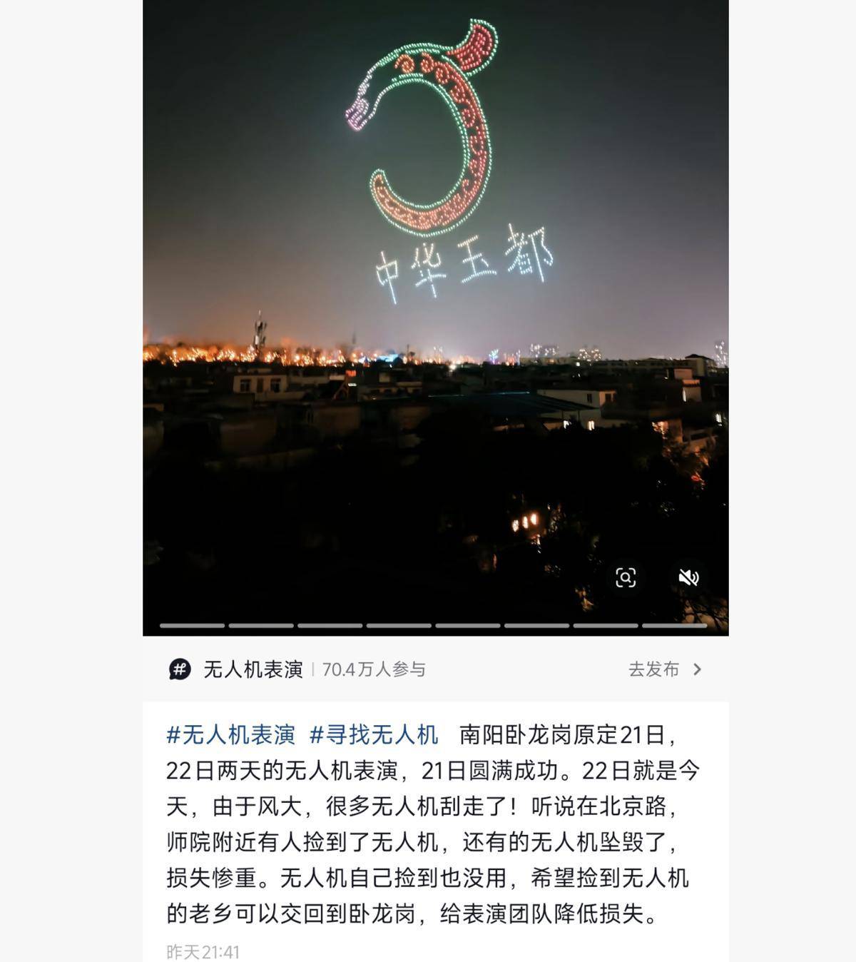 有网友称,2月22日(正月初六)晚,河南南阳一景区无人机表演突遇阵风,多架无人机被吹走,目击者称有如繁星。不少南阳网友在社交平台发文称,为了不让游客失望,景区及技术团队迎风将无人机升空进行表演,呼吁大家发现掉落的无人机及时归还。23日,景区工作人员向极目新闻记者表示,昨夜确实遭遇大风,部分无人机失联掉落,目前正在处理。