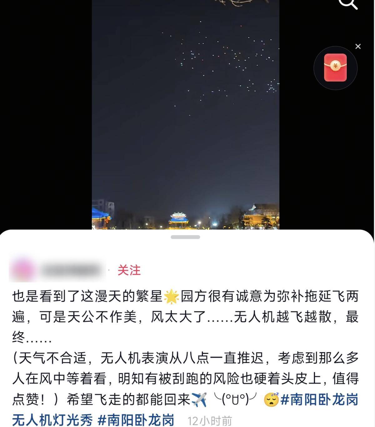 极目新闻记者也注意到,不少南阳网友在网上对因天气原因造成的表演不及预期表示理解。他们称,为了不让游客失望,景区及技术团队依然迎风将无人机升空进行表演,呼吁大家发现掉落的无人机及时归还。