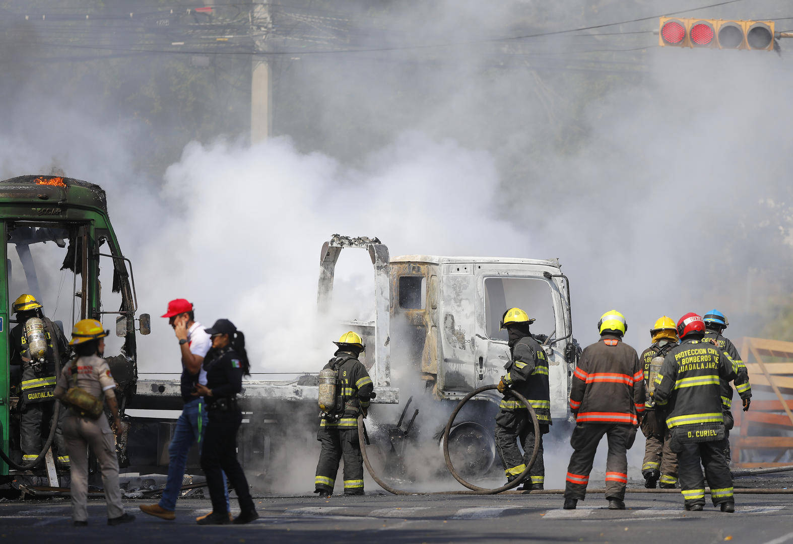 此外,在墨西哥至少6个州,CJNG集团用机枪扫射过路车辆,以达到瘫痪高速交通网络的目的。帮派分子们在道路上焚烧公共汽车、砸毁路边店铺,与墨西哥安全部队发生激烈的对抗。在首都墨西哥城,国际机场等重要交通枢纽被额外增派警力保护。
