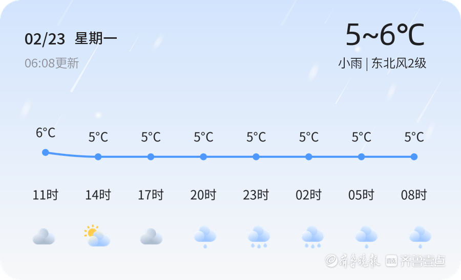 2月23日星期一农历正月初七,日照市迎来了一次小雨天气过程。今天最高气温为6℃,最低气温为5℃,目前气温3.1℃,阴雨绵绵,东北风2级,相对湿度64%,空气质量良好(PM2.5为35微克/立方米)。提醒市民出行时携带雨具,注意保暖和交通安全。今天11时至14时,天气由阴转多云,气温在5℃至6℃之间,风力3-4级,适合短时间户外活动。17时后,天气再次转阴,气温保持在5℃左右,东北风3-4级,建议市民下班时注意防雨保暖。20时至24时,雨势逐渐增强,气温维持在5℃,东北风3-4级,市民夜间出行需特别注意防雨防滑。未来三天天气多变。明天2月24日,天气晴转多云,最高气温7℃,最低气温2℃,风力3-4级,市民出行时需注意气温变化,适时增减衣物。2月25日,天气多云转阴,最高气温8℃,最低气温3℃,风力3-4级,适合安排户外活动。2月26日,天气阴,气温在3℃至8℃之间,风力转小,市民可适当增加户外活动时间。特别提醒,周三和周五气温波动较大,市民需注意防范感冒。温馨提示