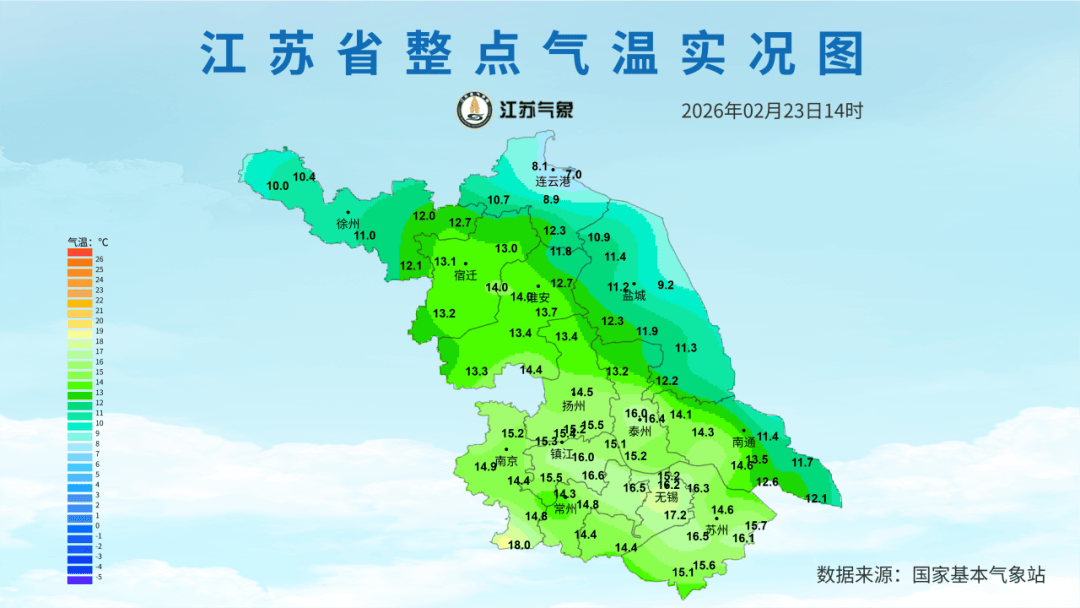 沿江和苏南地区多云转阴有小到中雨,其他地区多云转阴有小雨。最高温度:本省东南部地区14~15℃,其他地区11~12℃;最低温度:沿江和苏南地区8~9℃,其他地区6~7℃。全省东到东北风4-5级。