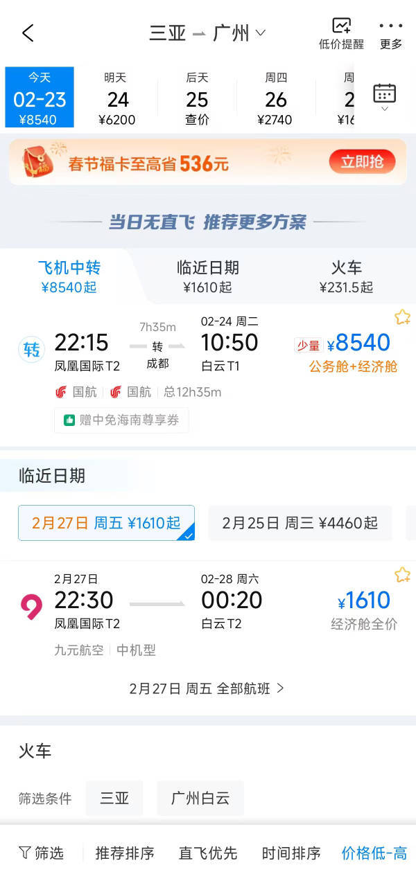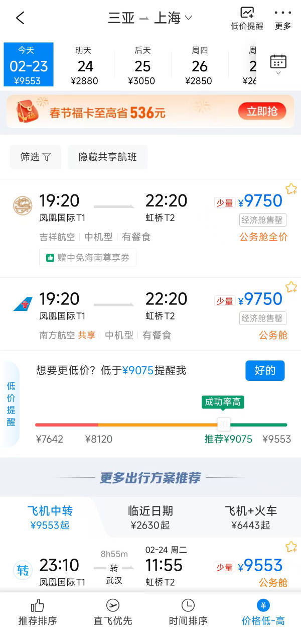 多家在线购票平台显示,由于票量紧张,2月23日(初七),从海南三亚等地飞往北京、上海、深圳等热门城市的机票价格大幅上涨,部分票价逼近万元。26日以后的票价大幅回落。