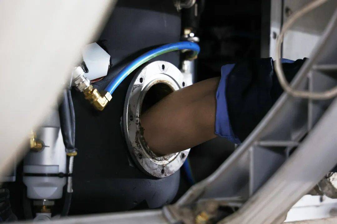 ▲地勤机械师严芝科和张浩准备打开动车厕所中转箱。