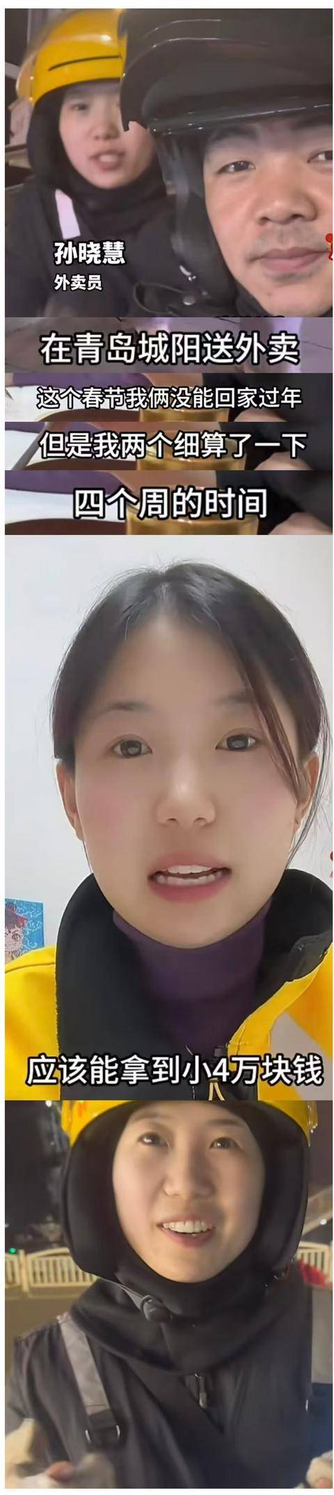 为了还债,2026年春节,他们将俩孩子送回老家,自己选择留在青岛。这也是他俩第一次春节不回老家,他们留下的理由很现实:春节单多、价高,四周时间他们赚了近4万块钱。孙晓慧说,“债,会一笔一笔还清,我俩不会一直送外卖,但会一直陪伴着彼此,跑下去……”