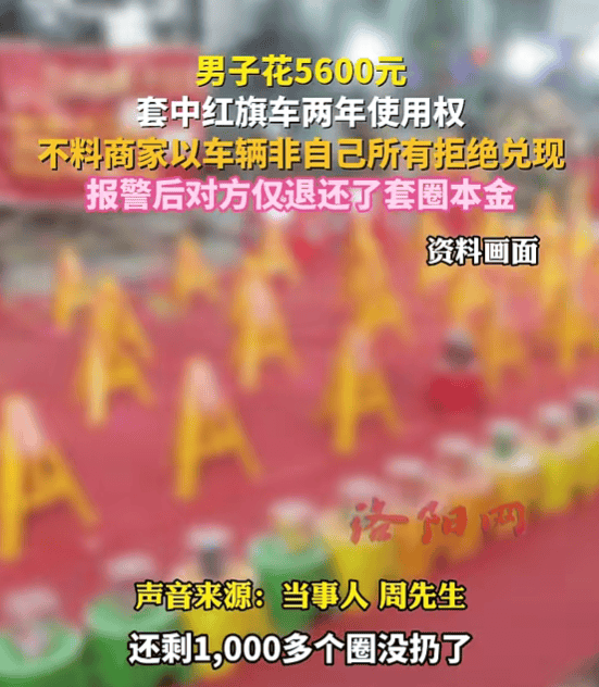 记者采访当事男子称:“套汽车套中了之后不给,当时商家说套中三次给两年的汽车使用权,我买了5600块钱的圈,还剩1000多个圈就套中了第三次。但商家说一分钱都退不了,找各种理由推脱。”