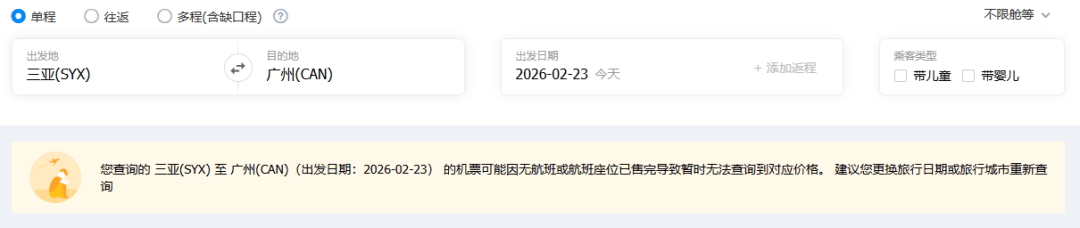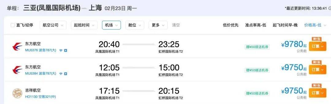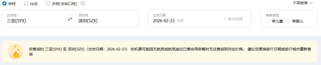 据界面新闻2月22日报道,记者查询多家在线旅游平台发现,2月22日至23日(初六至初七)期间,从三亚飞往北京、上海等核心城市的直飞航班经济舱几乎售罄,仅剩的公务舱票价普遍逼近万元大关。网友吐槽过完年“没有一万块从三亚回不来”。