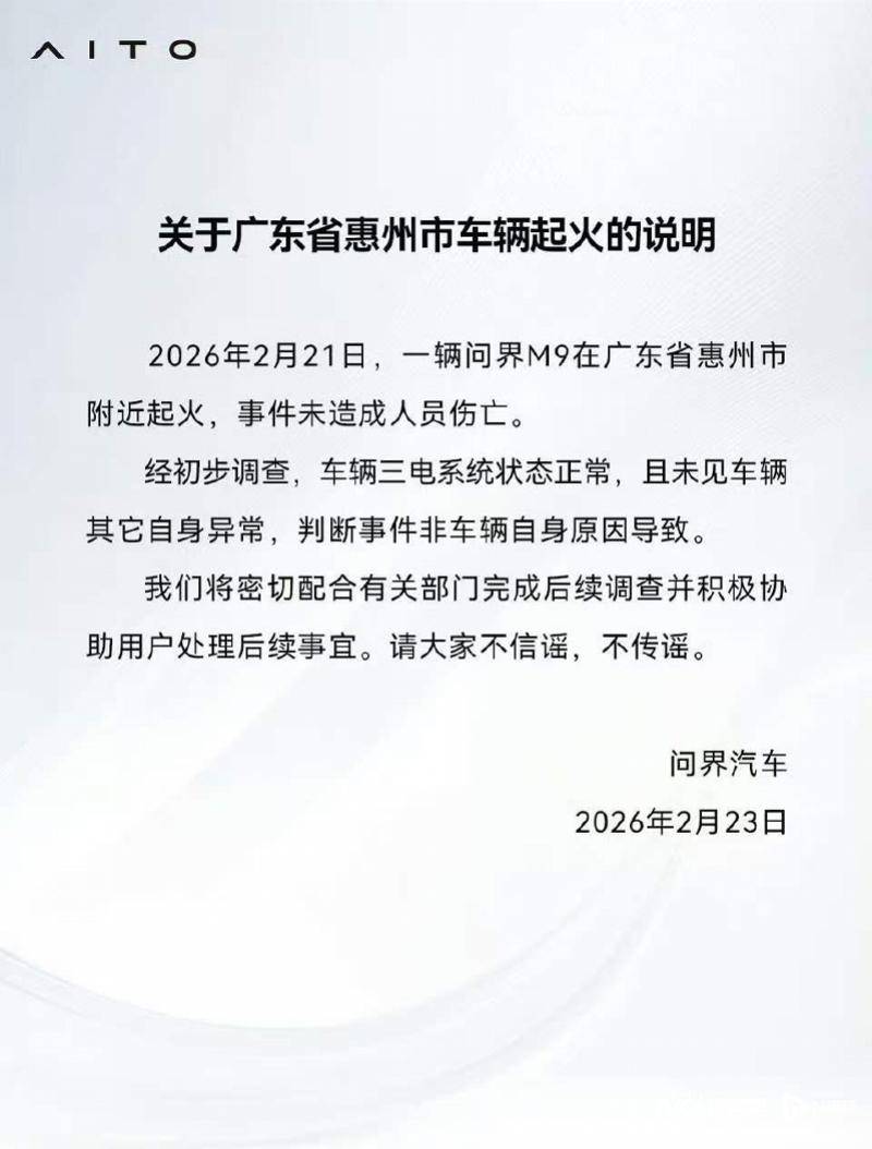 2 月 23 日,问界汽车发布关于广东省惠州市车辆起火的说明。问界汽车表示,2026年2月21日,一辆问界M9在广东省惠州市附近起火,事件未造成人员伤亡。经初步调查,车辆三电系统状态正常,且未见车辆其它自身异常,判断事件非车辆自身原因导致。